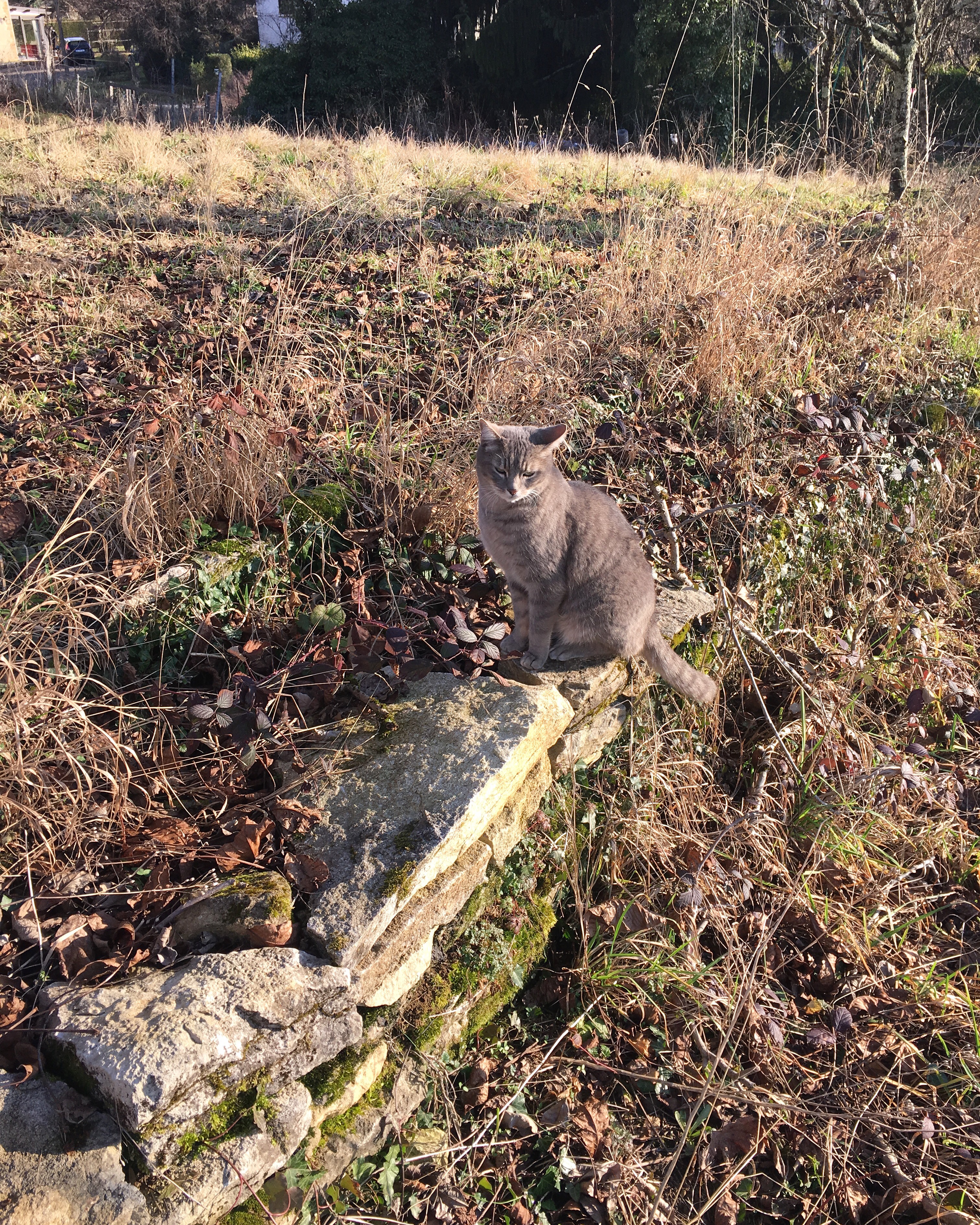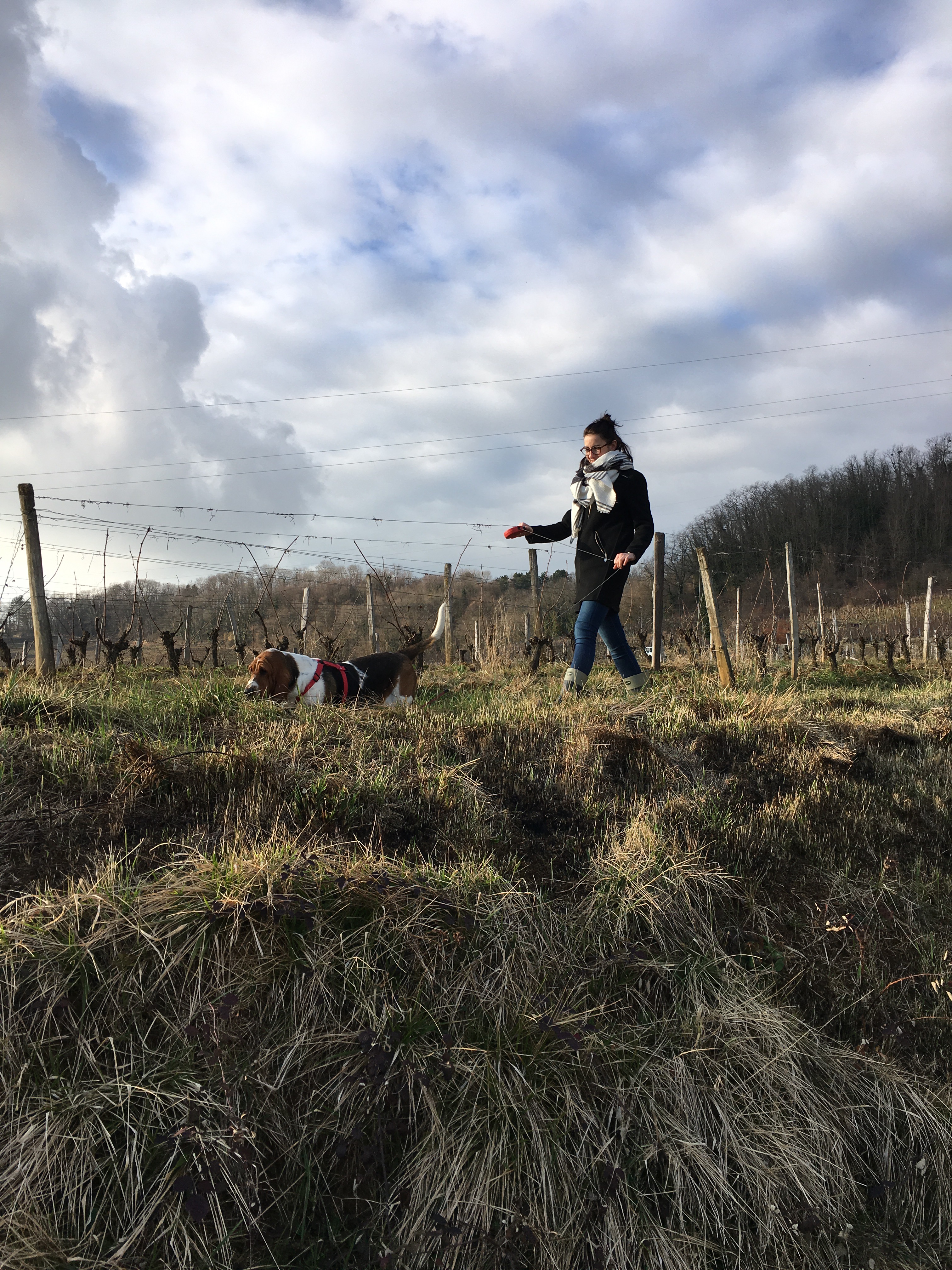Derrière la maison, les vignobles nous ouvrent la voie sur des chemins pentus. Il fait doux, le ciel est nuageux mais l’air est calme. Introuvable au milieu des vignes, on avance au rythme des animaux.
