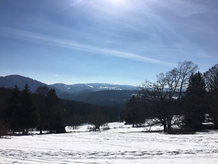 Après avoir emprunté les pistes de ski de fond à pied, tout de blanc vêtue, la montagne nous ouvre la voie sur un panorama immense : les Alpes et la Suisse nous font face.
